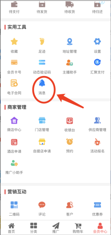 用户在前端会员中心--消息栏目中可以查看交易物流、提现通知、申请通知、客户通知、资产通知、服务通知、订单提醒、客服通知、后台推送的活动优惠等信息。