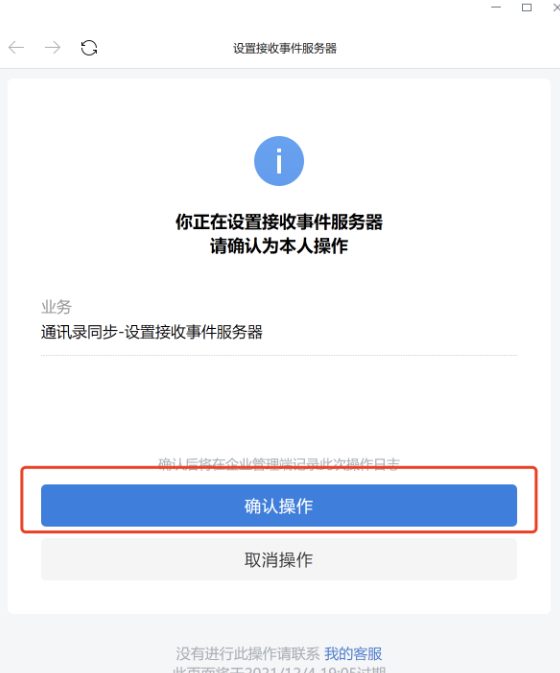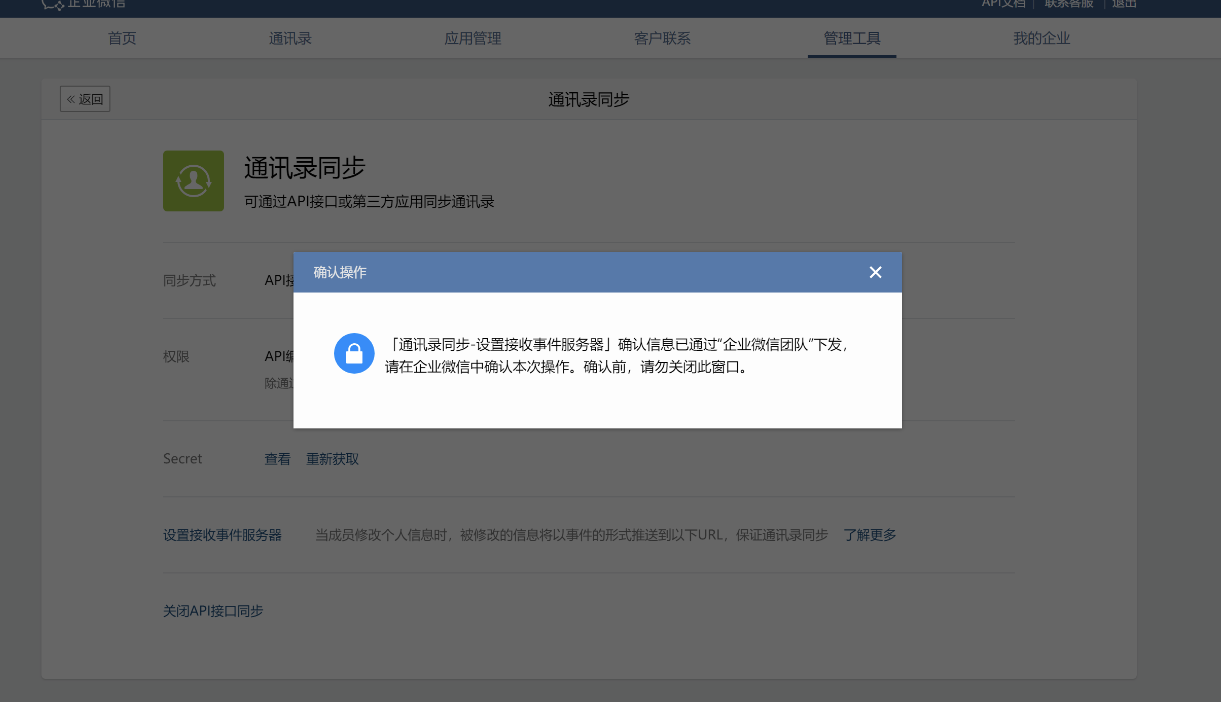 点击设置接收事件服务器,会弹出窗口提示在企业微信客户端进行二次确认;