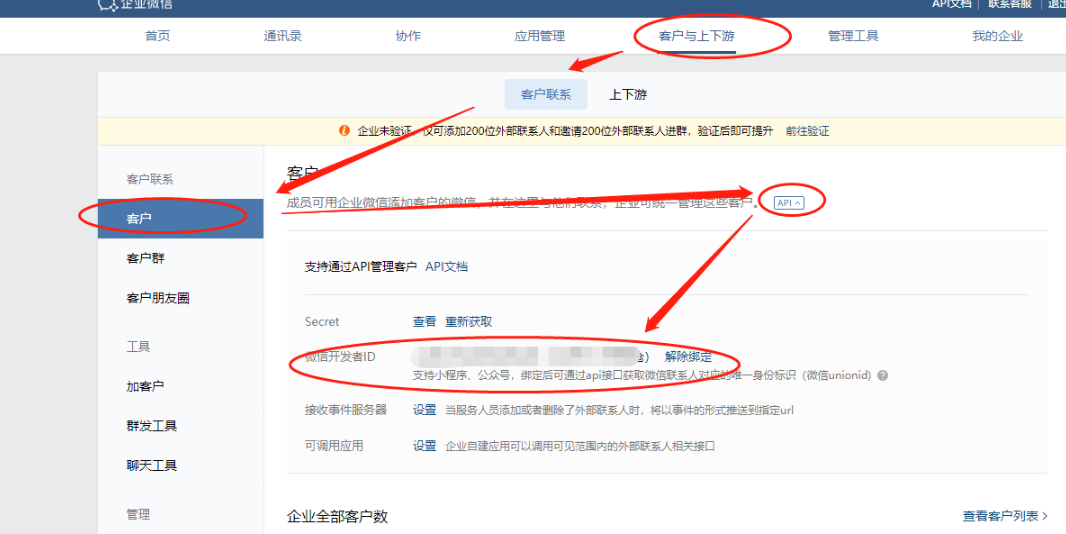 进入客户联系--客户,点击API--微信开发者ID--绑定,如下图: