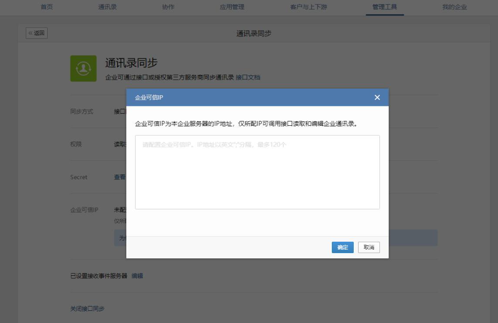 返回企业微信官方后台,通讯录同步,设置企业可信IP(即站点服务器ip)
