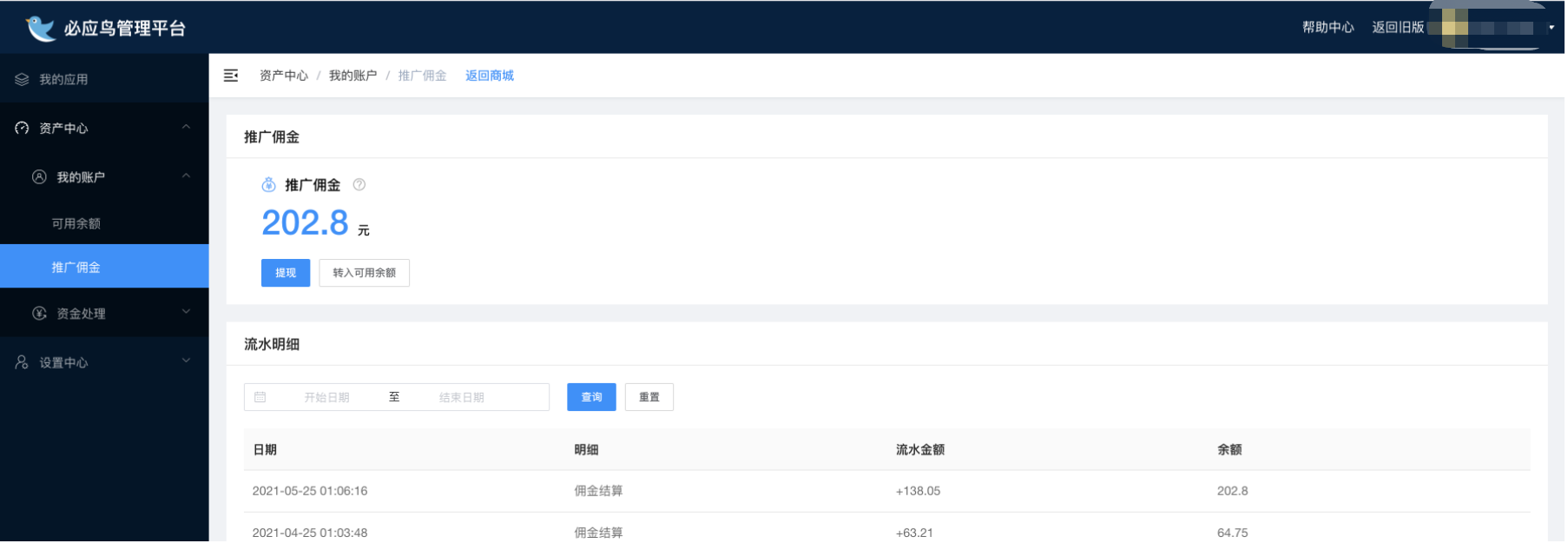 E企盈模王系统聚合CPS插件将必应鸟推广资源同步到模王系统聚合CPS APP中,商城会员购买CPS资源后平台获得CPS广告分成;其中涉及到的资金管理、分成佣金提现等操作如下: